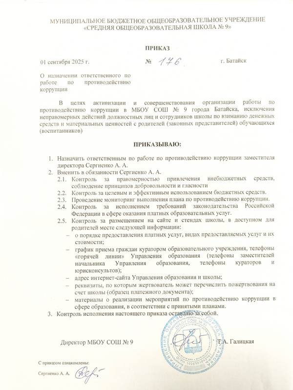| Приказ от 24 декабря 2024 № 370 МБОУ СОШ № 9 "О мерах по противодействию коррупции в сфере образования" | |